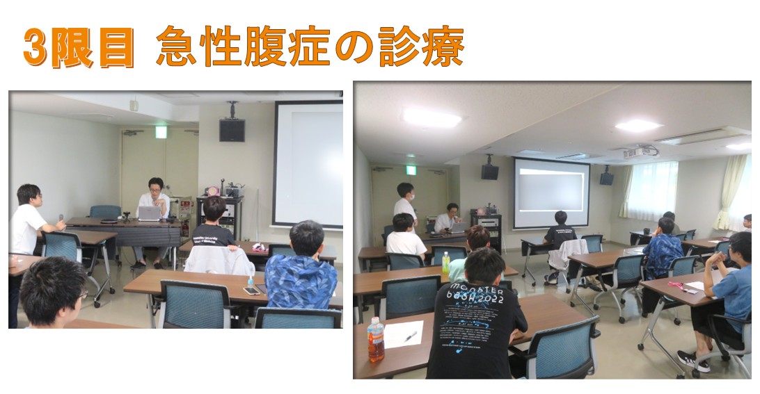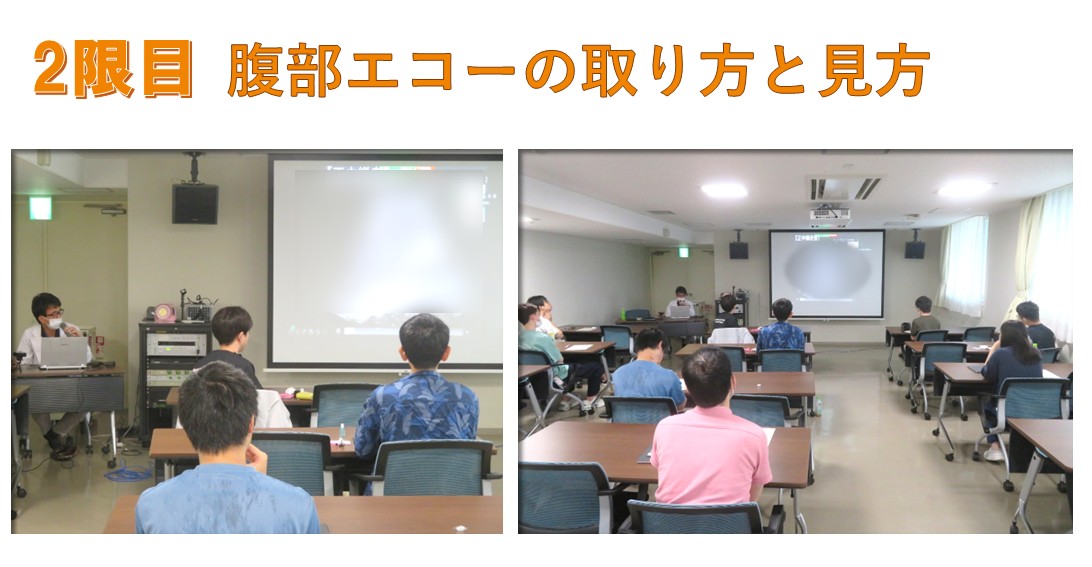 2限目は第一内科に所属している消化器内科の先生から超音波について教わりました。当直業務では当てることがありますが、理論が曖昧なところがあり、とても良い学びとなりました。様々な手技がありますが、ただ順番通りにやるだけではなく、理論を学ぶことの重要性を再認識できました。