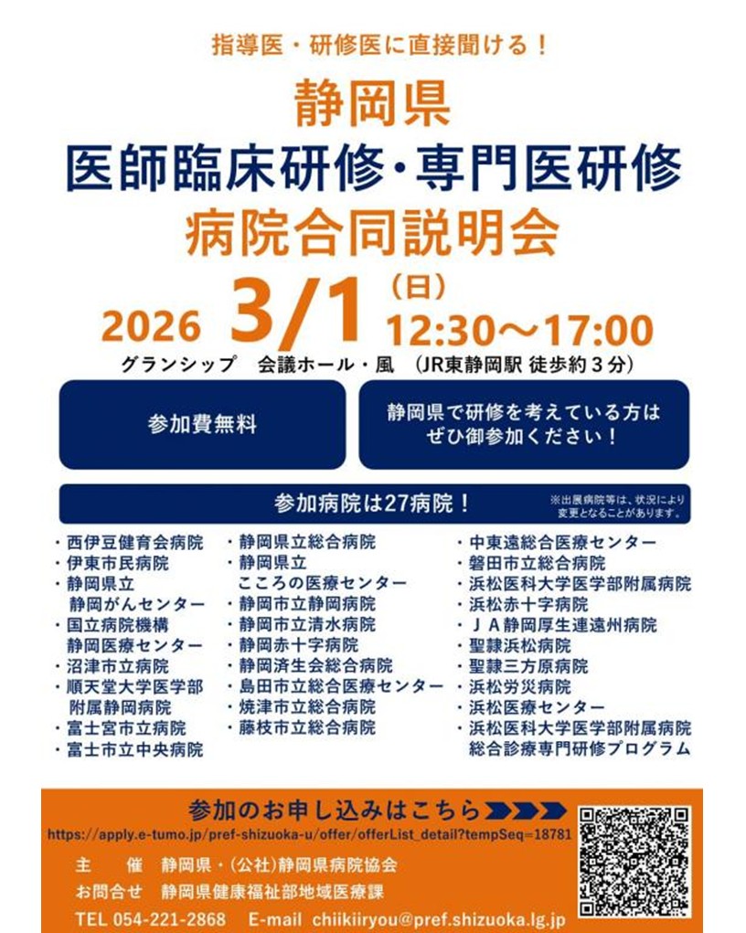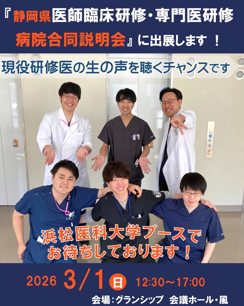 3月1日(日)にグランシップ静岡にて開催の「静岡県 医師臨床研修・専門医研修 病院合同説明会」に浜松医科大学も出展します。